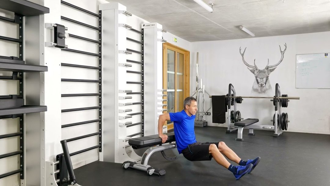 Place tes mains derrière toi sur une structure surélevée, jambes étendues. Descends lentement en pliant les coudes, puis pousse fort pour remonter à la force des triceps. Garde le dos près du banc et le regard droit.