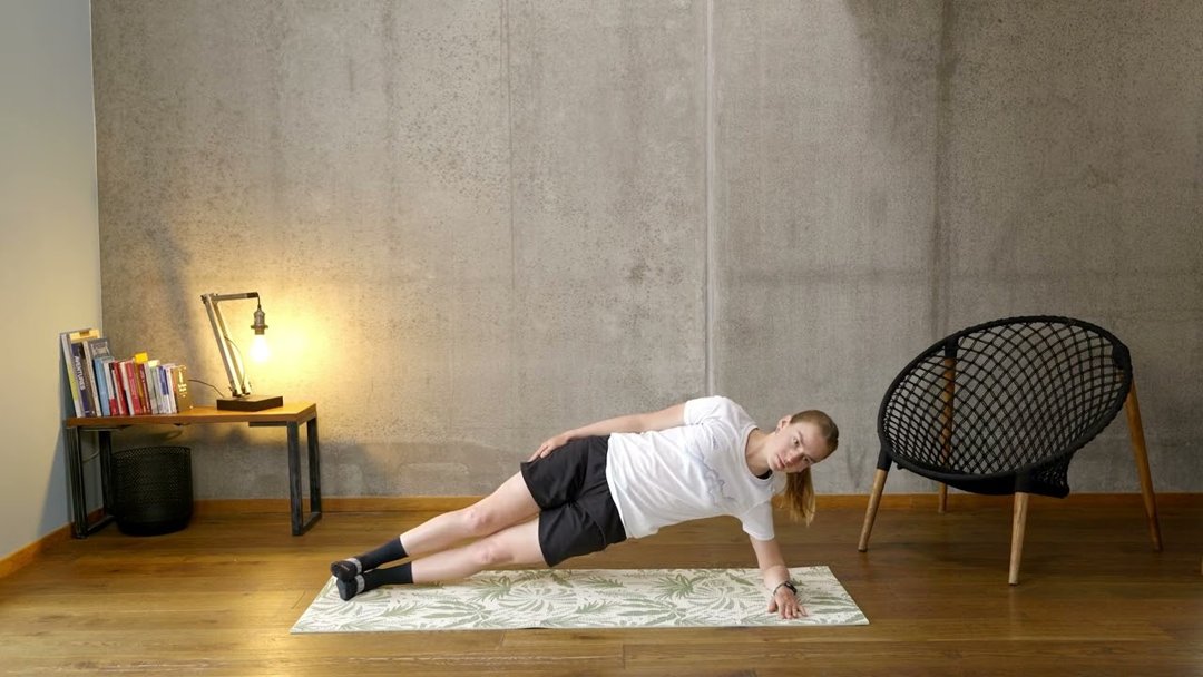 En appui sur l’avant-bras, sous l’épaule, décolle les hanches pour aligner chevilles, bassin et épaules. Garde le dos droit et le bras libre le long du corps. Maintiens la position sans relâcher la sangle abdominale, puis change de côté.