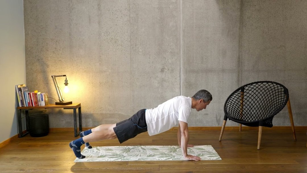 Place-toi en appui face au sol, mains plus larges que les épaules. Gaine bien tout le corps pour rester aligné des chevilles aux épaules. Descends la poitrine proche du sol en gardant les coudes proches du buste, puis pousse fort pour revenir bras tendus.
